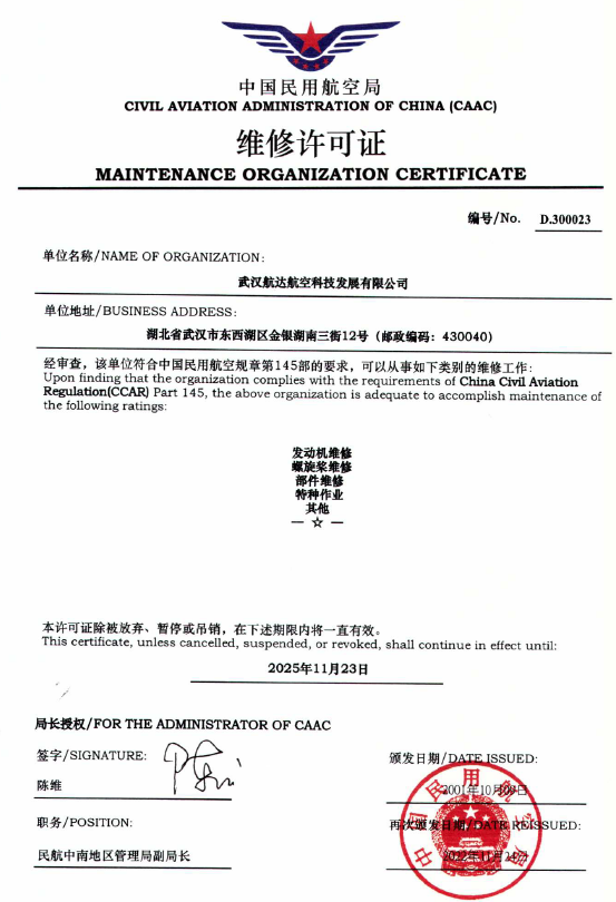 200110月    公司獲中國民航總局授權的民航維修許可證。